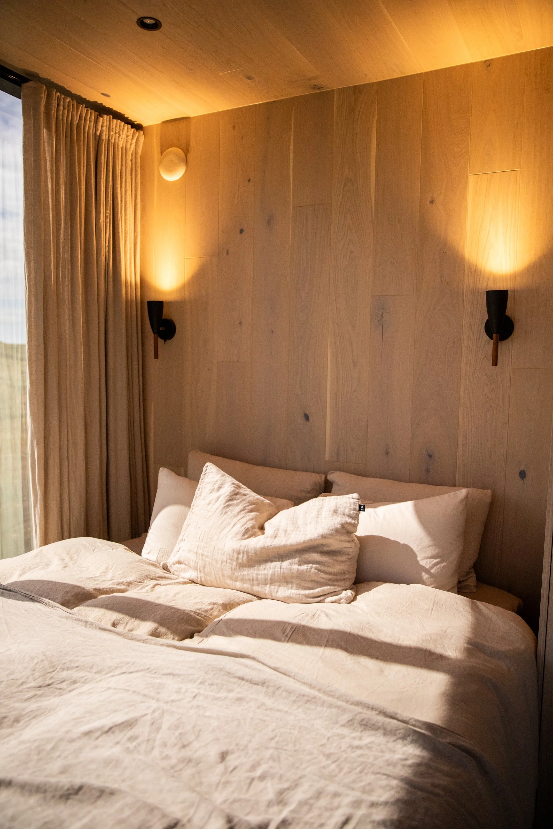 A neatly made bed with beige linen and pillows, placed against a wooden wall, with large windows revealing an outdoor landscape with hills and cloudy sky.