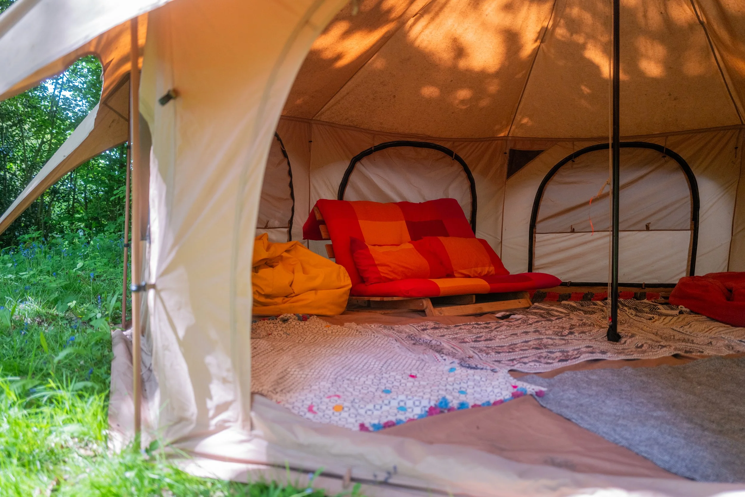 Inside a beige camping tent with red and orange cushions and blankets, surrounded by green trees and grass outside.